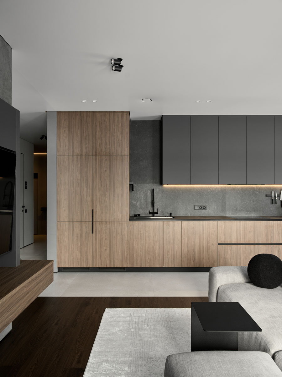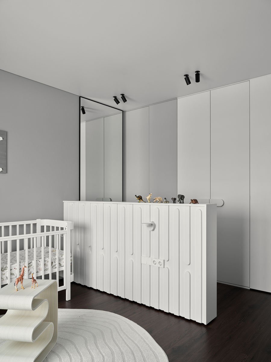 За внешним минимализмом и аккуратными стыками скрывается современная начинка: элементы умного дома, электрокарнизы, тёплый пол.